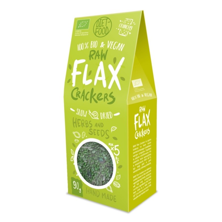 Raw Linen Crackers are delicious crackers based on linseed derivatives with the addition of vegetables and spices. You will only find the bio ingredients presented here. What does the green leaf on the packaging mean? The green leaf logo on the packaging of our Diet-Food crackers means that the product is ecological. The ingredients that are in its composition come from certified organic farming without the addition of pesticides and are not genetically modified, their taste is 100% natural. What is "RAW" technology and what does it mean for me? Our product is RAW, which means that in the production process we used the drying process at a temperature of no more than (42˚C), maintaining maximum nutritional values, so that you could eat a wholesome and healthy snack, while providing the body with a large amount of healthy plant protein.Composition and allergy information
