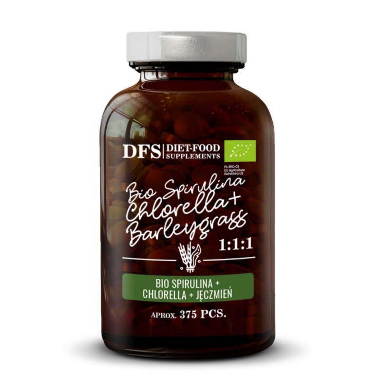 Suplement diety zawierający w jednej tabletce proszek ze spiruliny, proszek z chlorelli oraz proszek z trawy jęczmiennej (barley grass) z kontrolowanych upraw ekologicznych.