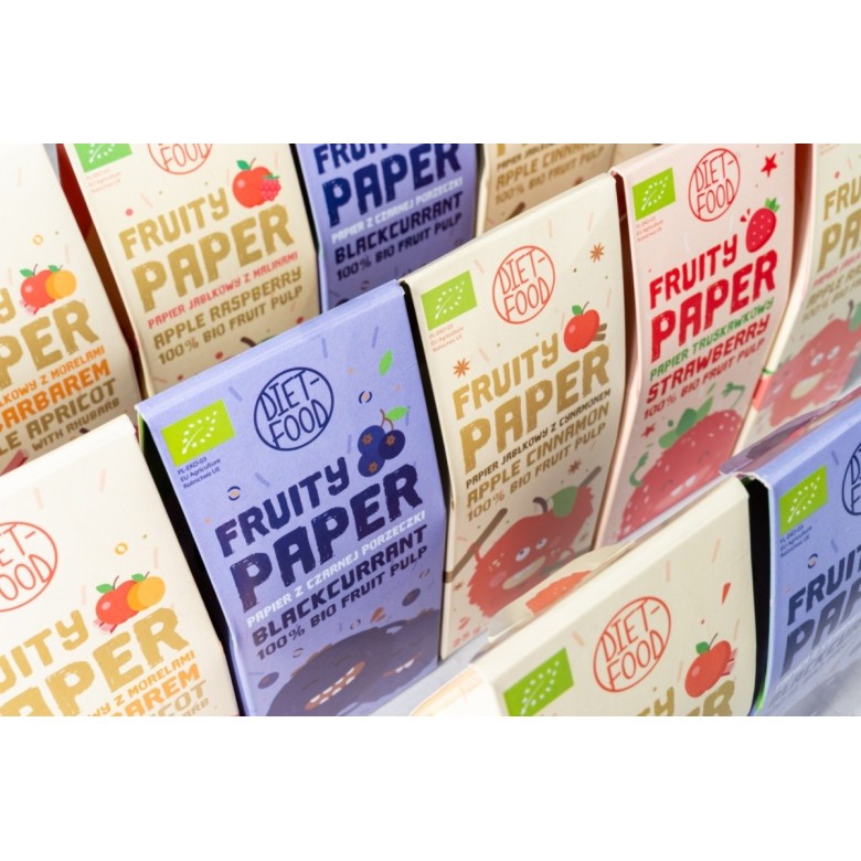 Papier owocowy - 100% bio owoców - doskonała przekąska bez cukru, barwników i polepszaczy. Owoce są blendowane na puree a później długo suszone, w ten sposób powstają cienkie papiery owocowe o intensywnym smaku, aromacie i pięknym kolorze i fakturze.