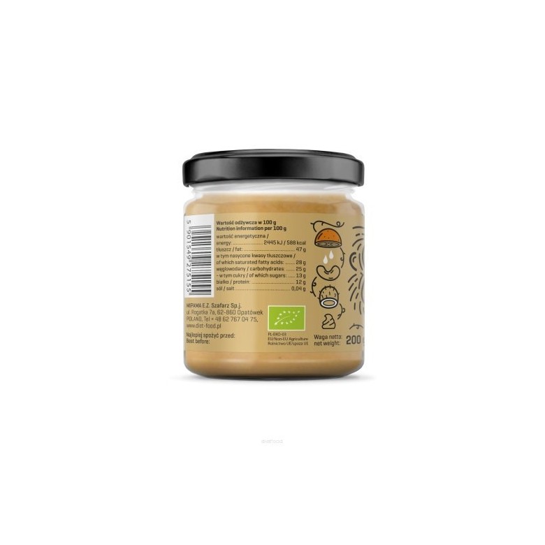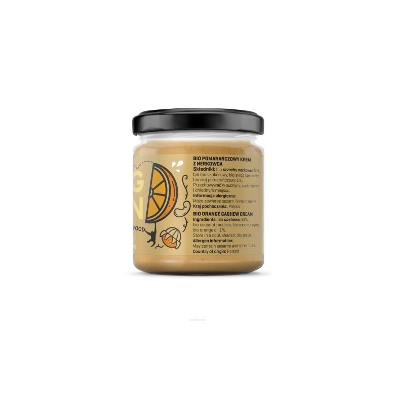 Naturalny, certyfikowany ekologiczny krem z orzechów nerkowca, pasty kokosowej syropu kokosowego oraz bio olejku pomarańczowego, bez sztucznych dodatków.