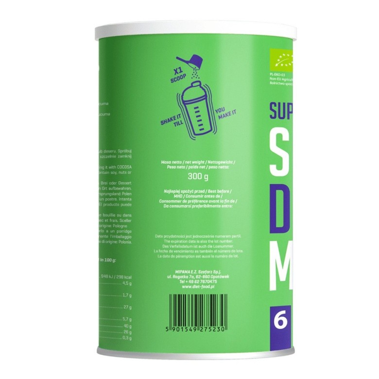 Zawiera w jednej łyżce (ok.15g) proszek ze spiruliny, proszek z chlorelli, proszek z trawy jęczmiennej oraz proszek z trawy pszenicznej z kontrolowanych upraw ekologicznych, by wzbogacić walory zarówno smakowe jak i odżywcze dodaliśmy sproszkowaną lucumę i energetyzujące kakao.