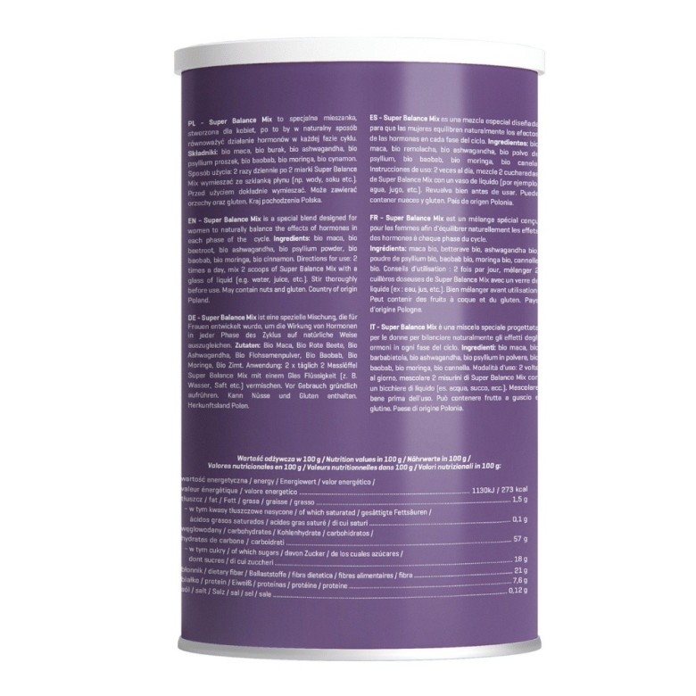 Super Balance Mix- to produkt stworzony specjalnie z myślą o kobietach. Jego skład to połączenie najwyższej jakości adaptogenów, których zadaniem jest równoważenie działania hormonów w każdej fazie cyklu. Znajdujący się w składzie korzeń Maca może łagodzić kobiece dolegliwości oraz jest doskonałym źródłem energii przez co może niwelować uczucie zmęczenia. Bio Ashwagandha łagodzi napięcia przedmiesiączkowe, zmniejsza objawy menopauzy oraz wiele innych dobroczynnych cech. Wszystkie składniki działają w symbiozie i stosowane w takim połączeniu zwiększają swoje walory.