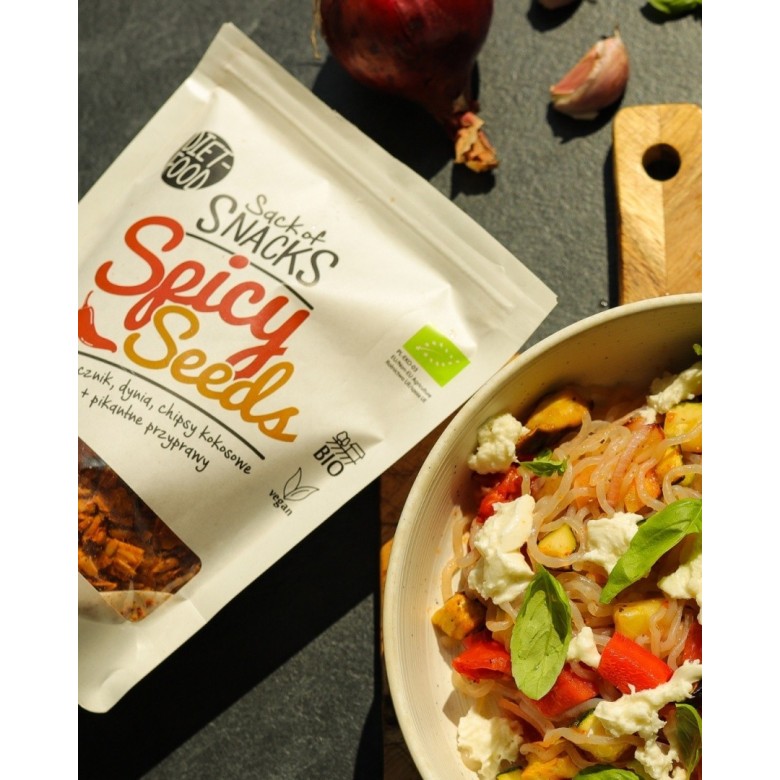 Sack of Snacks Seeds to seria ekologicznych przekąsek. W tej paczce umieściliśmy dla Ciebie Bio Spicy Seeds, czyli ekologiczne: nasiona słonecznika, pestki dyni oraz chipsy kokosowe wymieszane z wędzonymi i pikantnymi przyprawami prażone na specjalnej patelni bez użycia tłuszczu. Spicy Seeds to zdrowa i smaczna alternatywa dla chipsów, chrupek i innych niezdrowych przekąsek. Idealnie nadaje się do spożywania w pracy, w podróży czy jako dodatek do potraw/sałatek. Kraj pochodzenia: PolskaSkład i informacja alergiczna