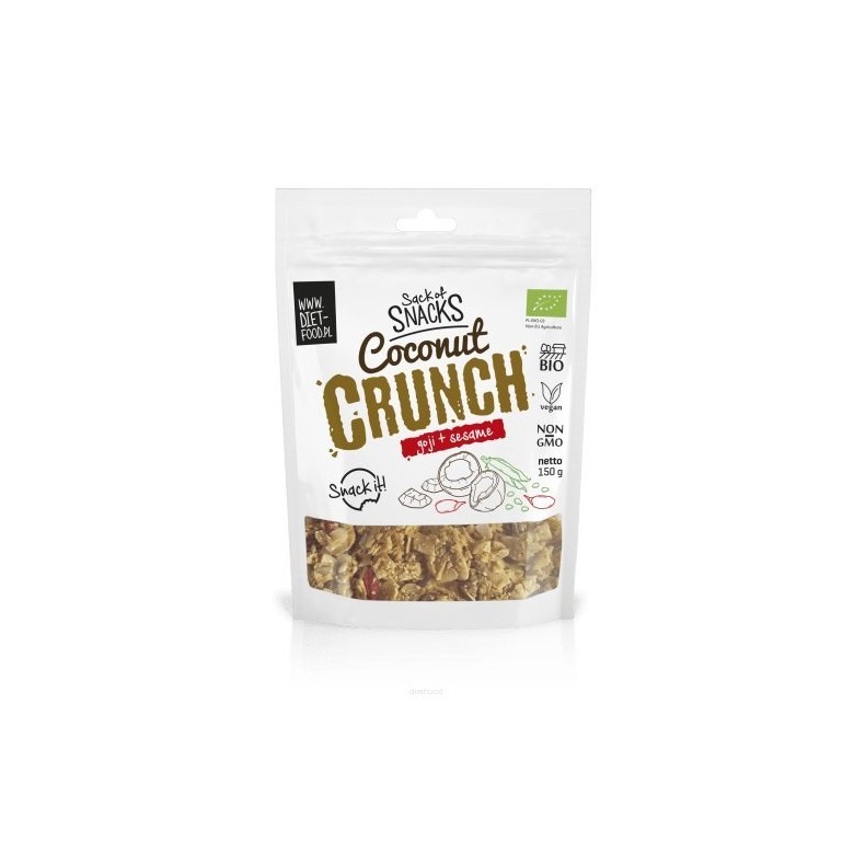 Bio Coconut CRUNCH to 100% naturalna, chrupiąca przekąska na bazie prażonych chipsów kokosowych z dodatkiem nasion sezamu oraz suszonych jagód goji. Bio Coconut CRUNCH to idealna przekąska dla dzieci i dorosłych.