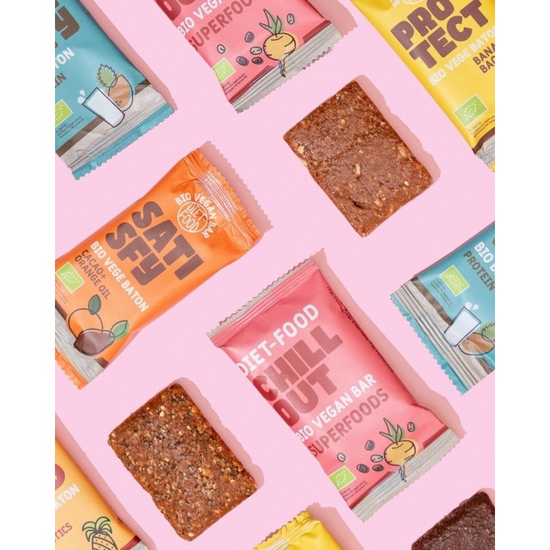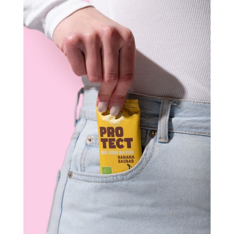 Bio wegański batonik PROTECT powstał z bio pasty daktylowej, bio suszonego banana, bio pasty ananasowej, bio kremu migdałowego, bio baobabu i bio szałwii hiszpańskiej. Produkt jest w 100% wegański, dlatego świetnie sprawdzi się w diecie wegańskiej i wegetariańskiej. Batonik stanowi idealną przekąskę w podróży, pracy lub szkole.